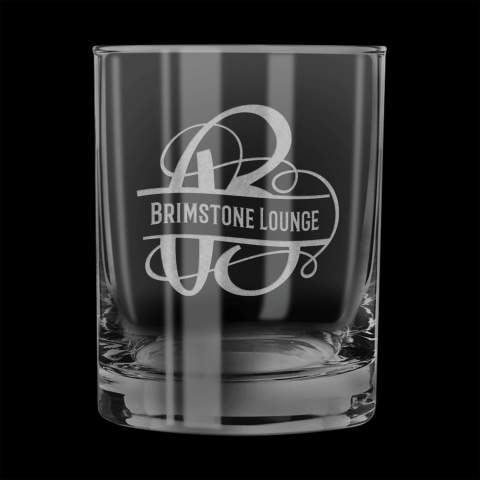 At 3 7/16" x 3 7/16" x 4 1/4", it's taller than a standard rocks glass and proportioned for a generous pour. The soda-lime glass construction handles commercial washing without clouding, and the smooth surface takes custom laser etching cleanly - frosted personalized marks read with strong contrast on clear glass.