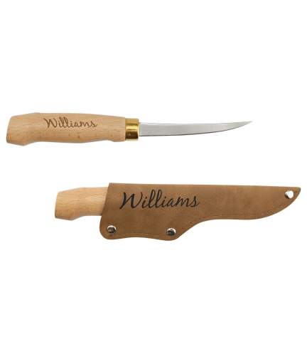 The 4" stainless steel blade resists corrosion for saltwater and freshwater use, and the included genuine leather sheath with snap closure and riveted belt loop keeps the blade protected and accessible in the field. Accepts laser engraving on the blade or handle for names, dates, logos, and custom text - a solid personalized gift for anglers, hunters, Father's Day, and groomsmen. Comes packaged in a gift box.