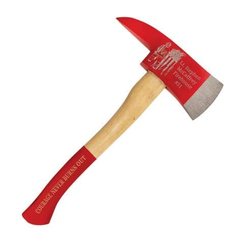 At 17 1/2" overall, the axe still reads as a real firefighter's tool rather than a novelty. The 1045 carbon steel blade and beech wood handle are the same construction approach as the larger model - materials that have actual history in fire service equipment, which matters when you're presenting something to someone who spent a career around the real thing.